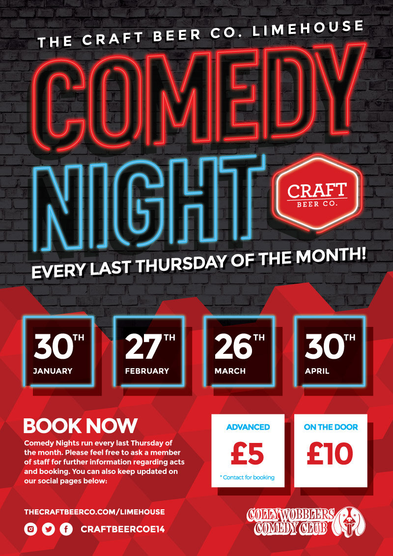 The Craft Beer Co. Limehouse Comedy Nights run every last Thursday of the month. Please feel free to ask a member of staff for further information regarding acts and booking. You can also keep updated on our social pages.